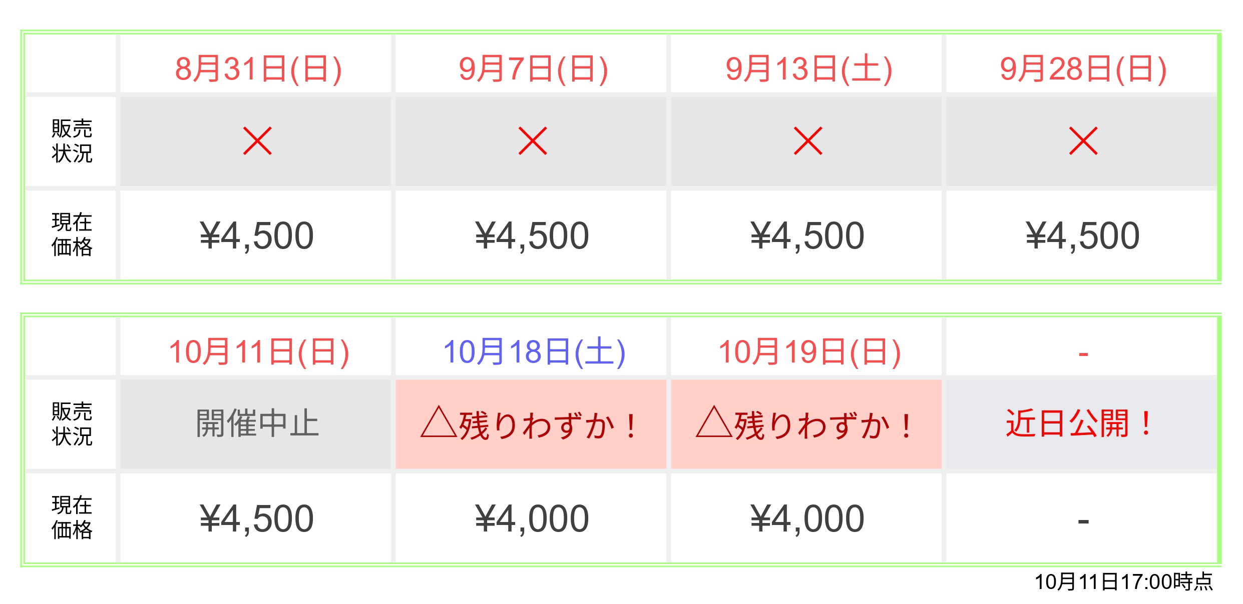 前売り券の販売状況や開催シーズン、出演者状況に合わせて価格を変動させていただきます。
