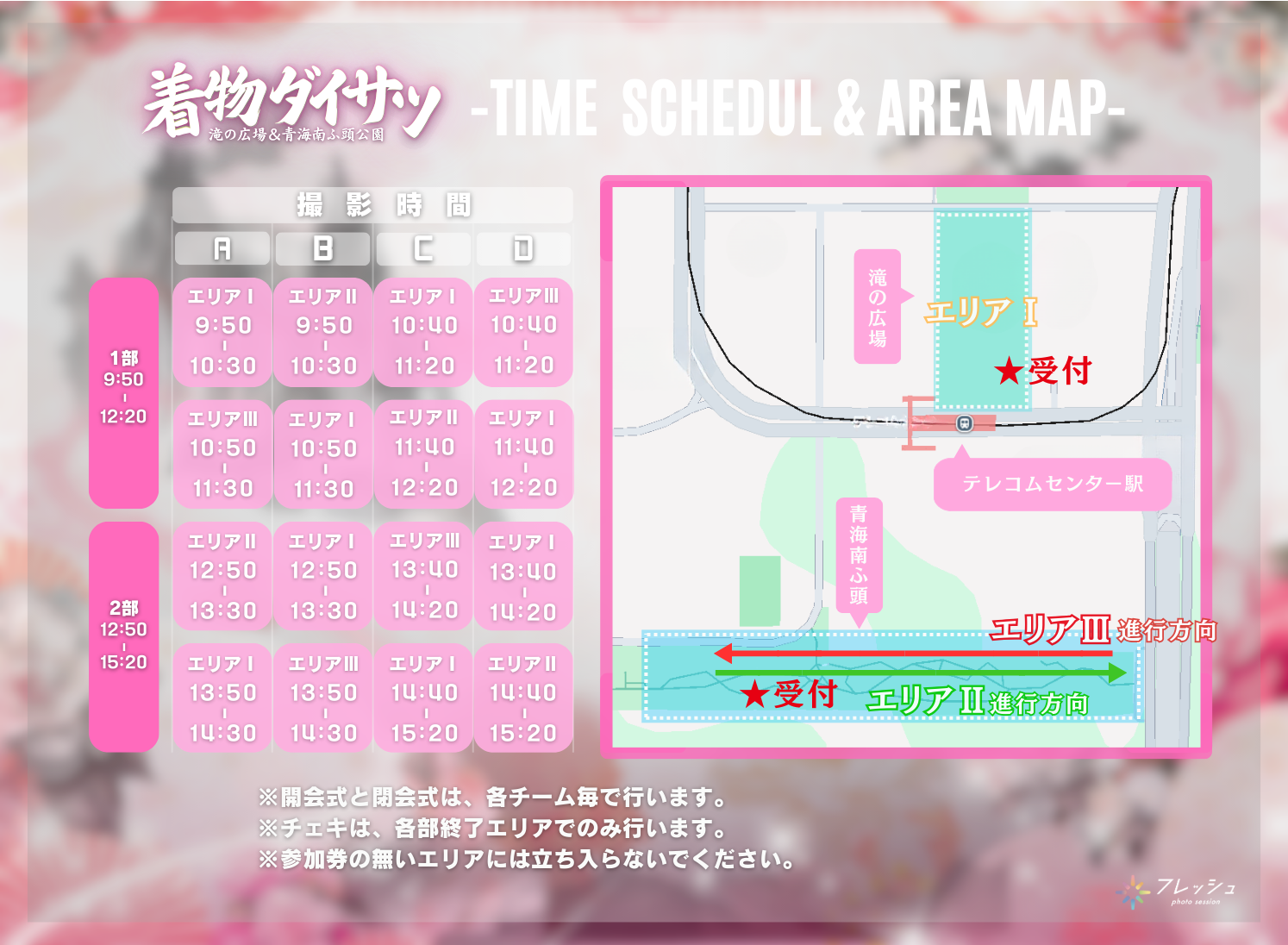 ※各時間帯、当日の状況により、撮影エリアや撮影時間を調整させていただく場合がございます。詳しくは開会式や受付にてご確認ください。